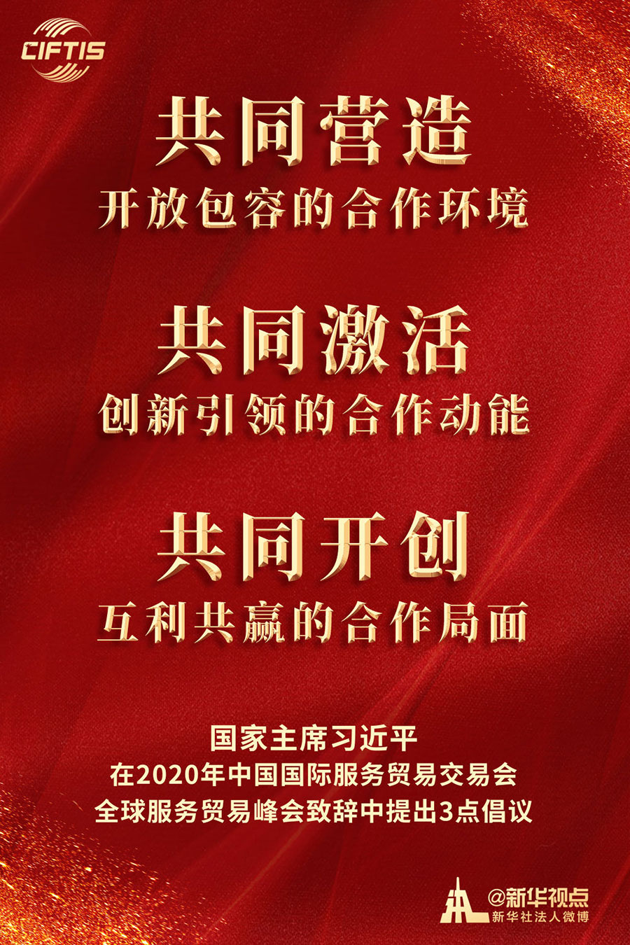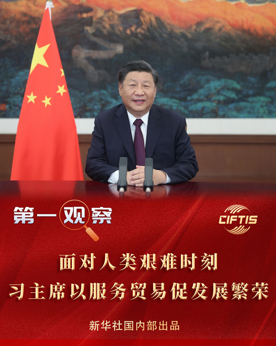 “希望以此為契機,搭建起平臺和橋梁,讓各國人民充分展示服務(wù)貿(mào)易領(lǐng)域新發(fā)展新突破,共同享受人類社會發(fā)展進步新技術(shù)新成果。”習(xí)近平主席在致辭中說。