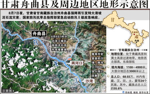 舟曲縣位于甘肅南部,甘南藏族自治州東南部,東鄰武都縣,北接宕昌縣,西南與迭部縣、文縣和四川省九寨溝縣接壤。全縣總面積3010平方公里,轄20個(gè)鄉(xiāng)、2個(gè)鎮(zhèn),210個(gè)行政村,總?cè)丝?3.47萬(wàn)人,其中藏族4.4萬(wàn)人,占32.78%。