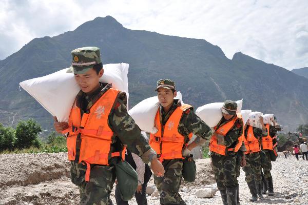 武警戰(zhàn)士為舟曲村莊群眾運(yùn)送物資