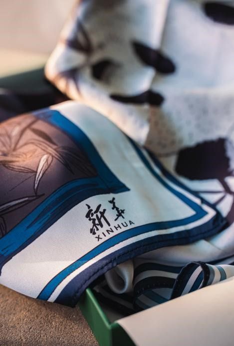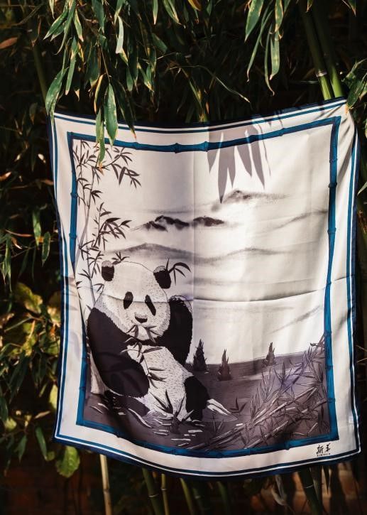 此外,礼盒配备以熊猫花花为设计灵感的丝巾,撷取大熊猫“和花”品尝竹叶的灵动瞬间,以细腻笔触勾勒熊猫悠然栖息于竹林之间的和谐画面,丝巾材质柔滑垂顺,图案精致典雅,在水墨配色中,传递熊猫“和花”的憨萌之态。
