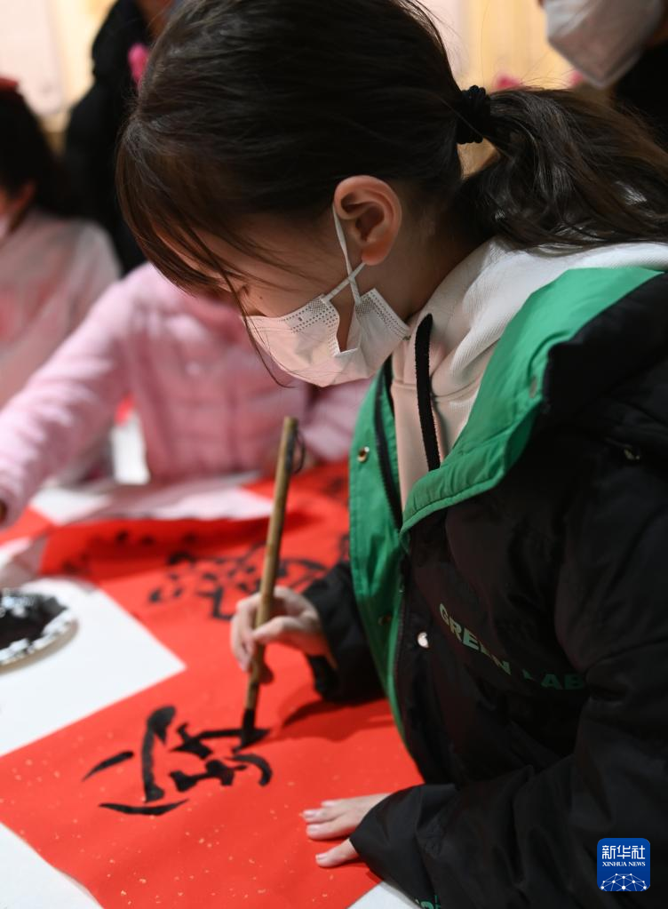 2月4日,小朋友在写毛笔字。