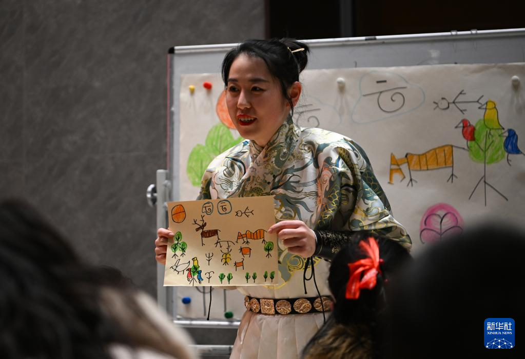 2月4日,老师向小朋友讲解甲骨文字画。
