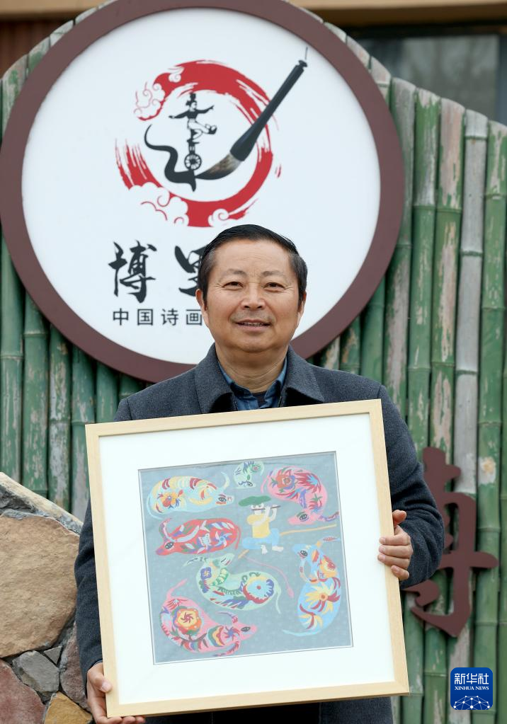 3月21日,当地农民画家潘宇在博里画苑展示制作完成的农民画刺绣作品。