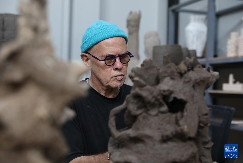托尔斯滕·尤雷尔在江西景德镇陶溪川陶瓷文化创意园自己的工作室内观察一件正在创作的作品(4月20日摄)。