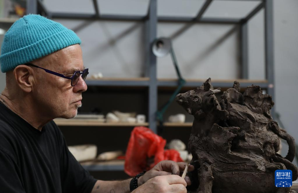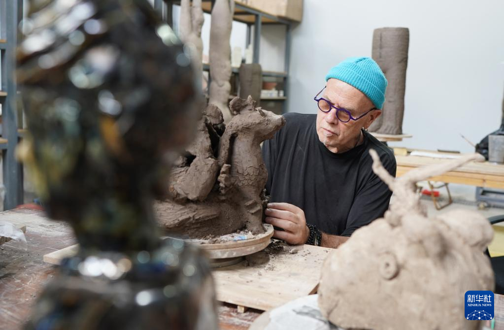 托尔斯滕·尤雷尔在江西景德镇陶溪川陶瓷文化创意园自己的工作室内创作(4月20日摄)。