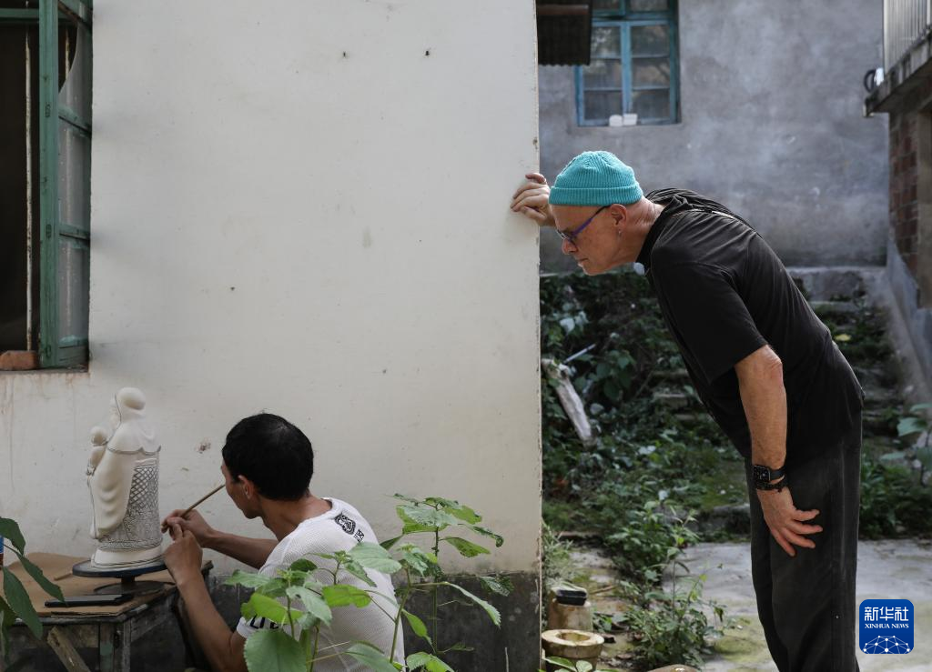 在江西景德镇雕塑瓷厂,托尔斯滕·尤雷尔在观摩一名陶瓷师傅创作(4月20日摄)。