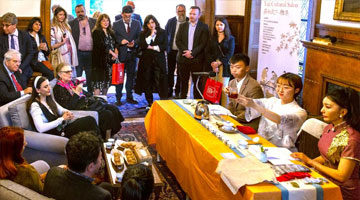 5月7日,在瑞典首都斯德哥尔摩的中国文化中心,瑞典民众观赏茶艺展示。