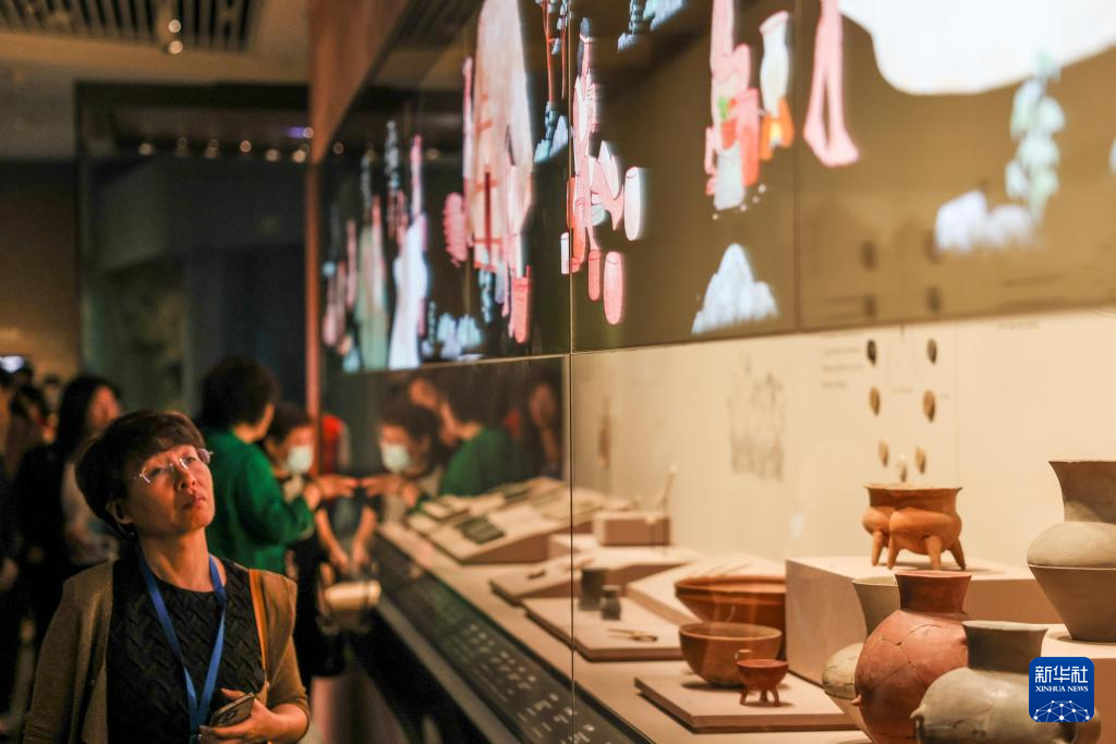 5月16日,观众在参观“海岱日新——山东历史文化展”展出的史前时期陶器。