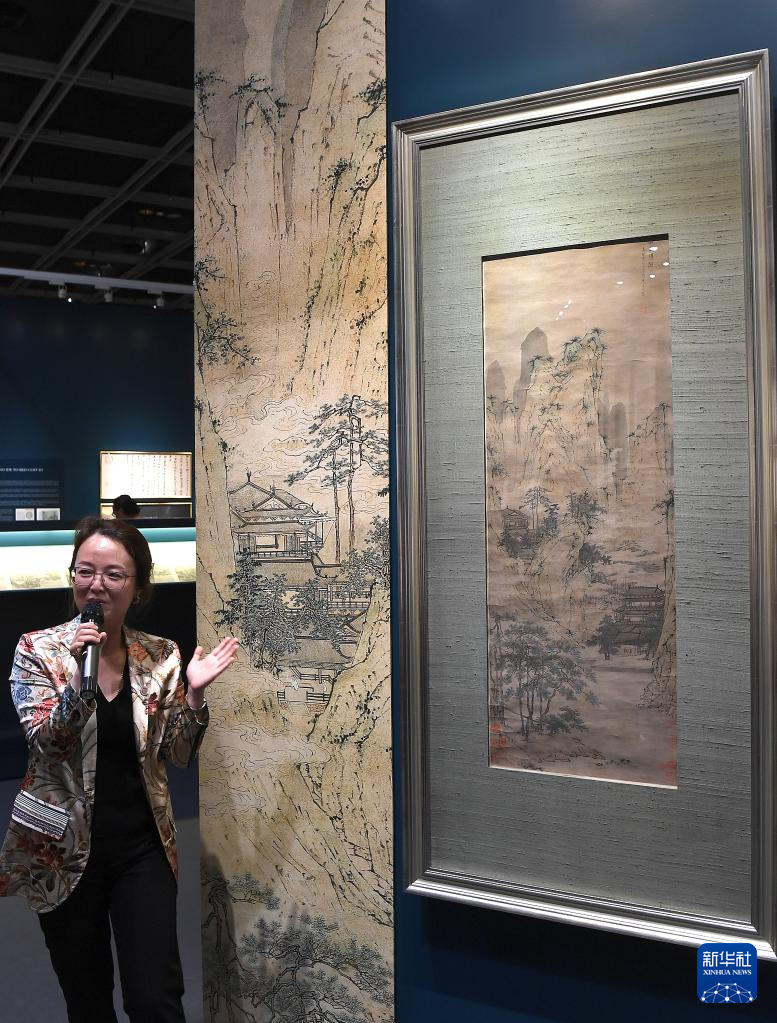 5月24日,在香港会议展览中心,工作人员讲解拍品明代画家仇英的作品《仙山楼阁》。新华社记者 陈铎 摄