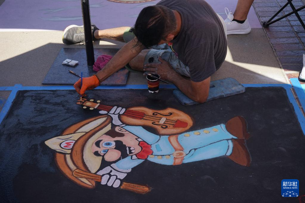6月18日,艺术工作者在美国加利福尼亚州帕萨迪纳市举行的粉笔画节上创作。