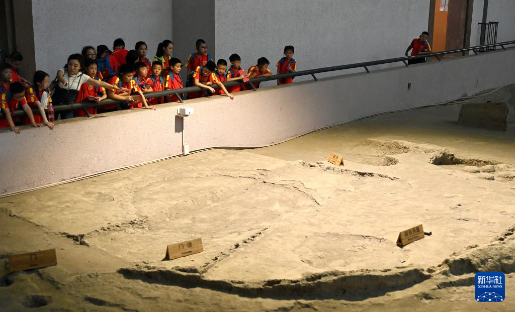 研学学生在西安半坡博物馆参观一处圆形房屋遗迹(8月9日摄)。