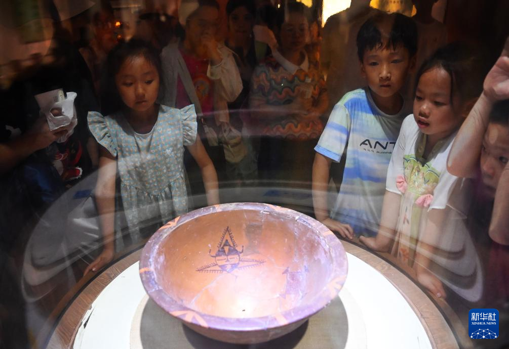 参观者在西安半坡博物馆里观看人面网纹彩陶盆(8月9日摄)。