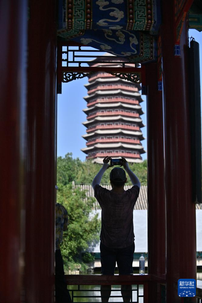 8月28日,参观者在中国园林博物馆镜影亭参观。