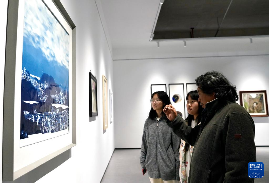 12月14日,罗小聪(右)在景德镇陶瓷大学的展览馆内和学生分享自己的创作心得。