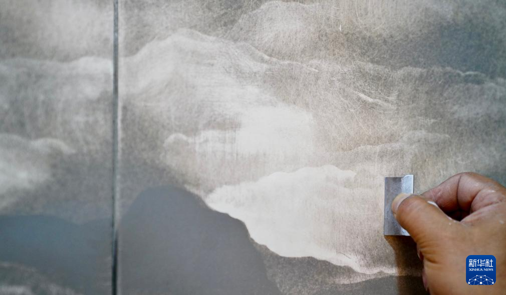 12月14日,罗小聪在工作室内用刀片“绘制”云彩。