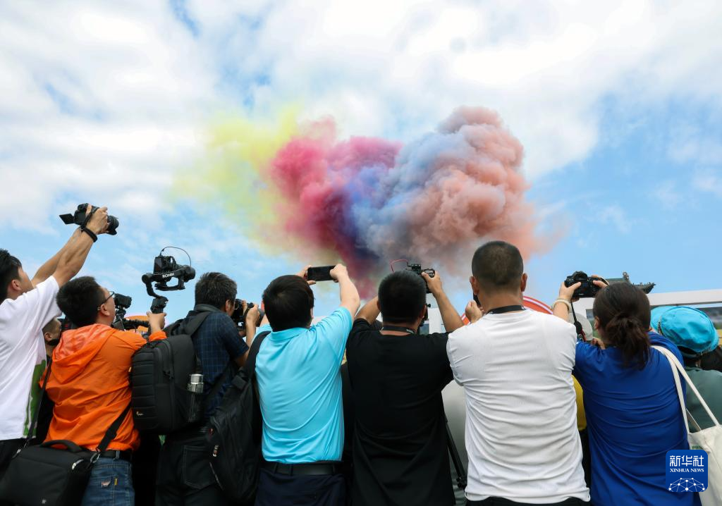 9月19日,中外摄影人在开幕式上拍摄彩色烟花造型。