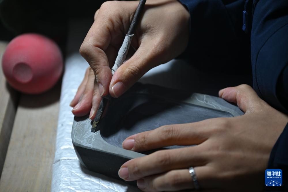 11月25日,邹天然在雕刻易水砚。
