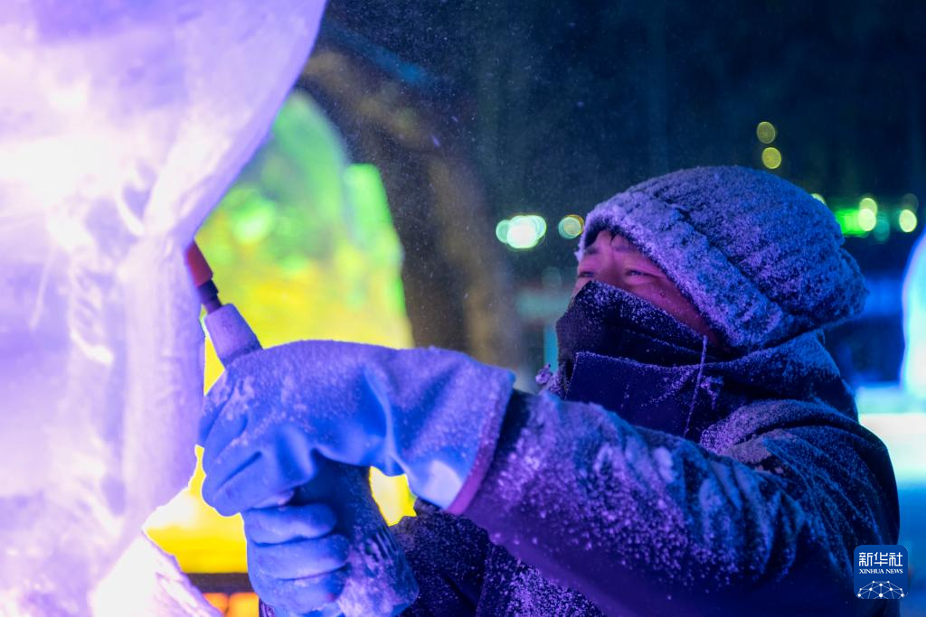 1月2日,在哈尔滨市道里区,冰雕师在兆麟公园内创作冰雕作品。