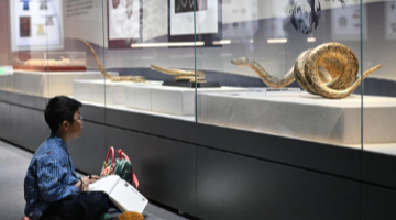 1月21日,观众在“聚宝之盆——新疆文物珍品展”拍摄猪首人身俑(复制品)。