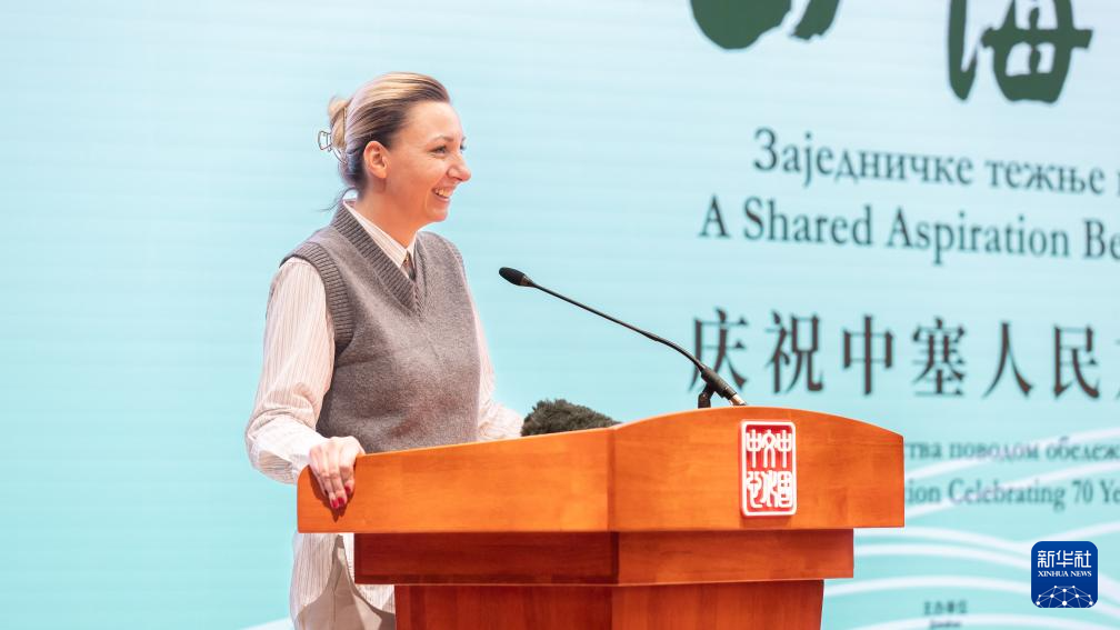 10月17日,在塞尔维亚贝尔格莱德的中国文化中心,塞尔维亚负责性别平等事务的不管部长马楚拉在“山海志合——庆祝中塞人民友谊70年书画展”开幕式上致辞。