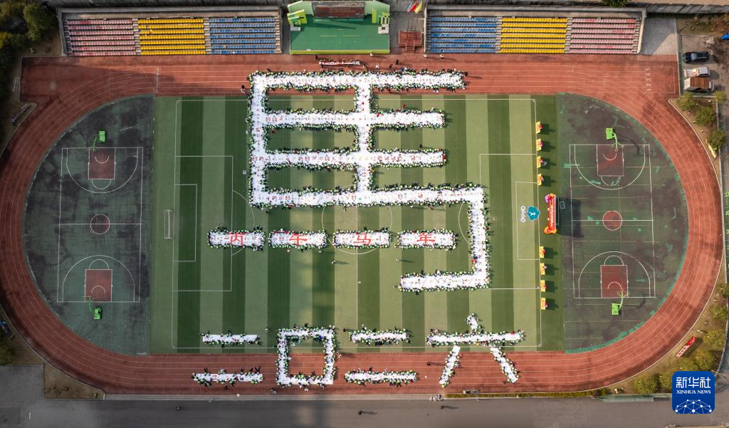 1月14日,四川省自贡市荣县树人小学校操场上,千余名师生共同在巨型“马”字轮廓的画布上创作,以纸绘、陶板绘等形式画出各式生肖马。