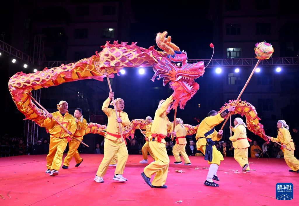 2月27日,村民在湖北省宣恩县高罗镇歌乐城社区进行舞龙表演。
