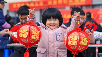 2月28日,小朋友在江苏省泰兴市济川街道商井社区元宵节主题活动中展示灯笼。