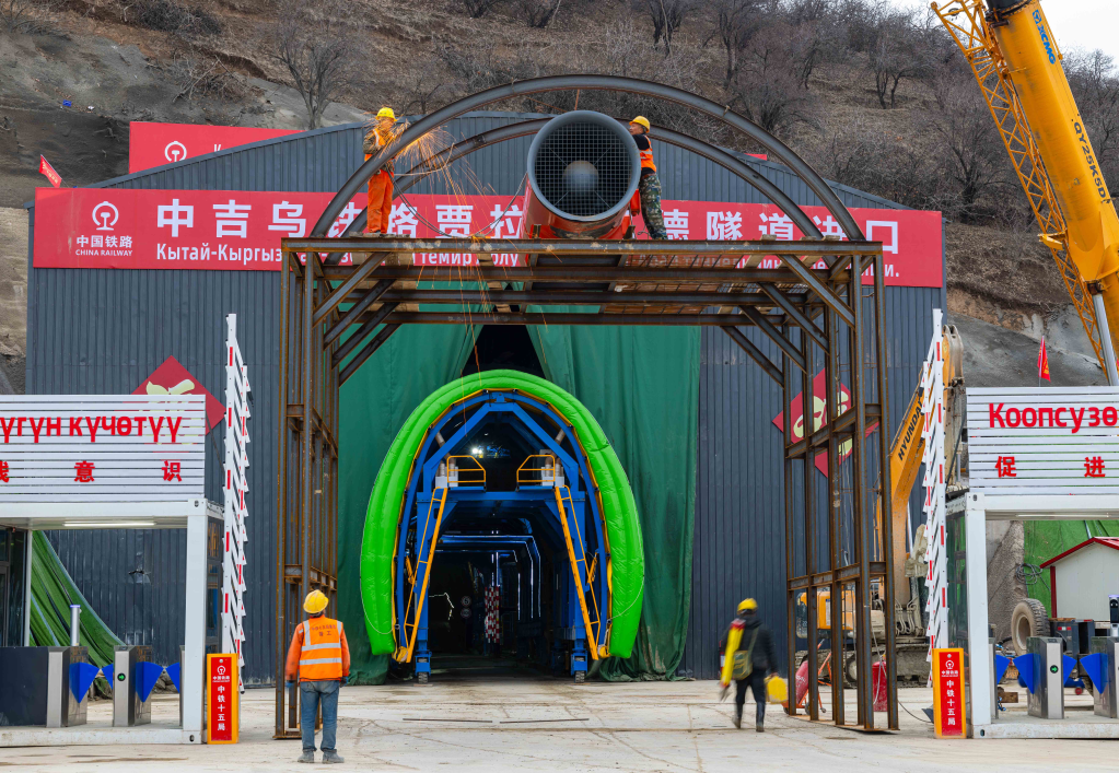 图为2026年2月11日,在吉尔吉斯斯坦贾拉拉巴德州,中国建设工人为中吉乌铁路贾拉拉巴德隧道安装隧道通风设备。新华社发(任卫云摄)