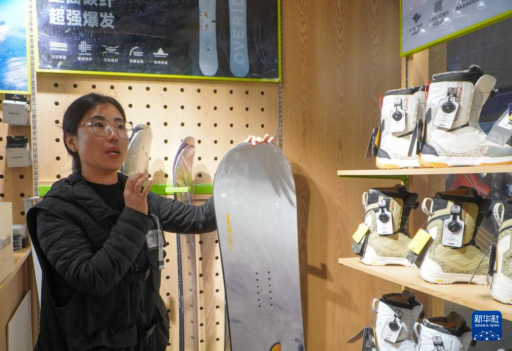 在吉林北大湖滑雪度假区商业街内的一家国产品牌雪具店内,工作人员展示我国自主研发生产的滑雪板(2024年11月15日摄)。新华社记者 颜麟蕴 摄