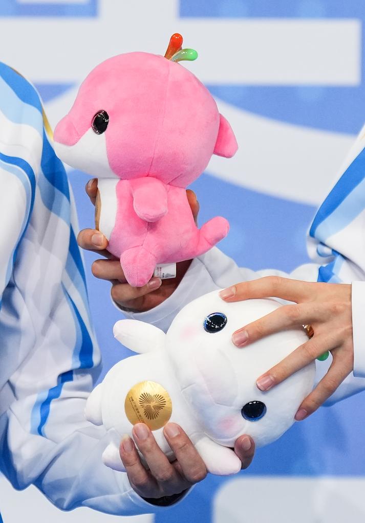 11月14日,第十五届全国运动会游泳男子100米自由泳决赛在广东省深圳市举行,图为冠军浙江队选手潘展乐和教练在颁奖仪式上交换吉祥物。新华社记者 薛宇舸 摄
