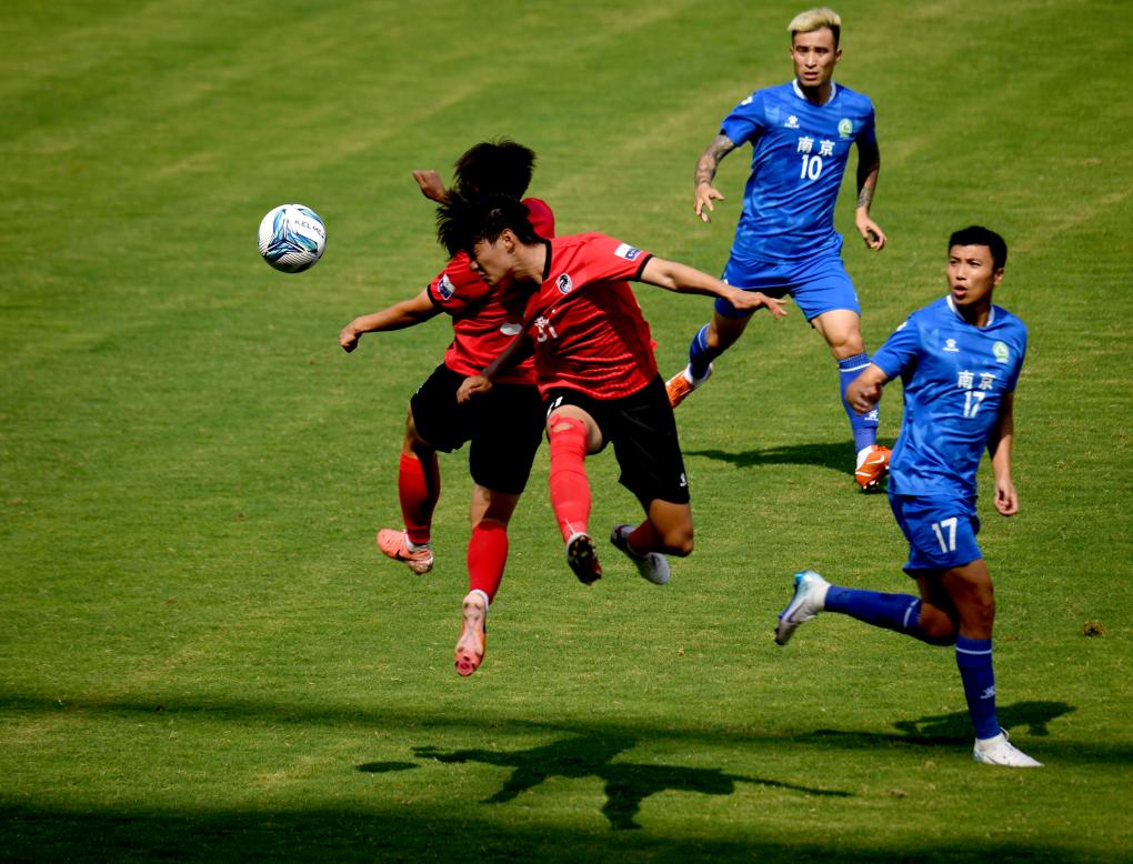 6月14日,球员在“苏超”淮安队对阵南京队的比赛中拼抢。新华社发(曹政摄)