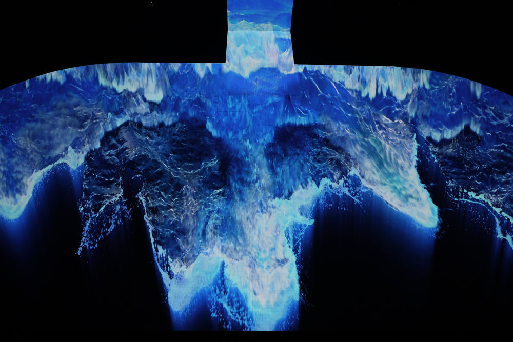 2025年7月16日,在意大利威尼斯,参观者在第19届威尼斯国际建筑双年展中国馆观看展品《苍穹》。本届中国馆展览以良渚文明、敦煌石窟、北京中轴线、城市交通与未来城市为主题,展现中国建筑在传统与未来之间的对话与思考。