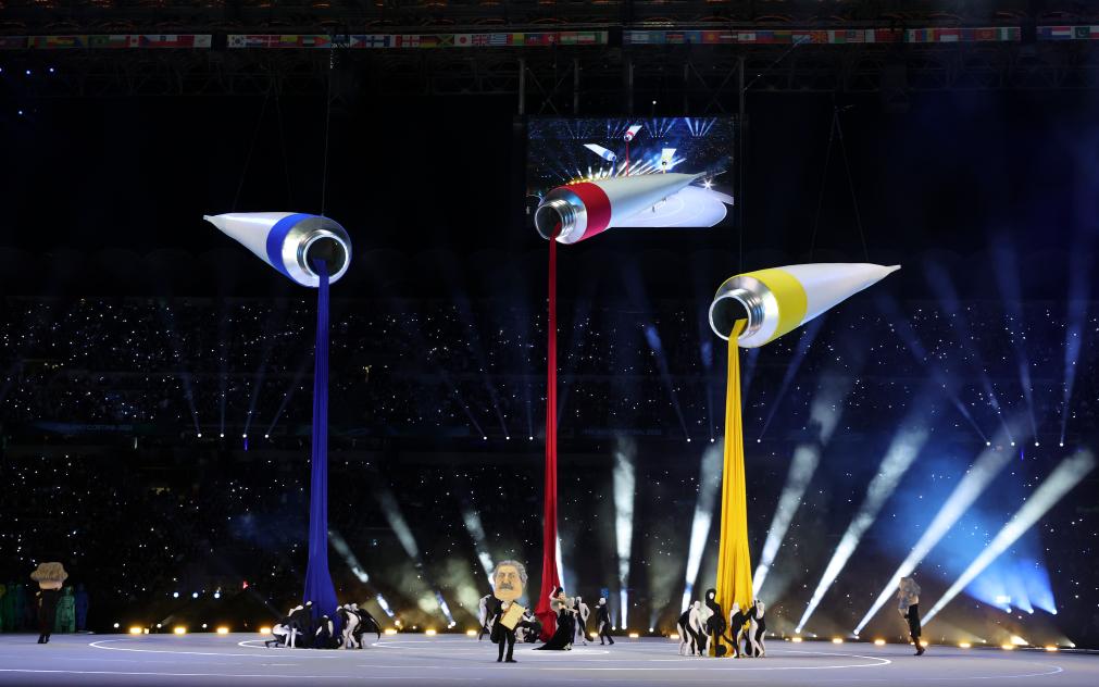 红、黄、蓝三支巨型颜料管出现在开幕式主会场舞台上空,“颜料”源源不断地涌出。同时,身着各种色彩、代表意大利不同文化符号的演员在舞台上尽情舞蹈。这些符号有:古罗马、文艺复兴、美食、时尚、设计、建筑、文学、咖啡、狂欢节……没错,这一切都“很意大利”。