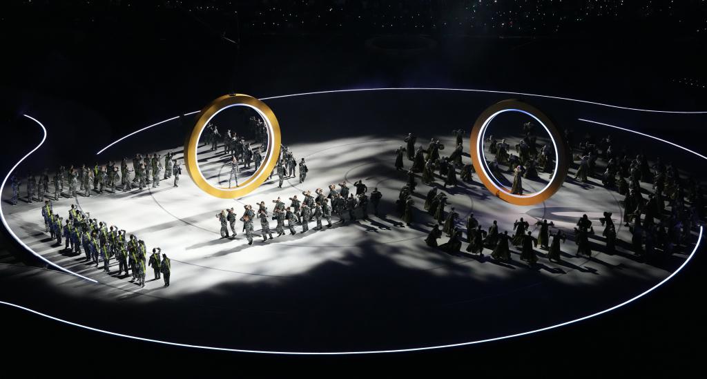 两名舞者,服饰不同,舞姿各异,分别代表着“城市”与“山脉”。在这场城与山的对话中,两名舞者各自站在一个圆环中间。圆环缓缓升起,两人从各自的圆环跃出,象征着走出自己的世界,寻找交汇点,实现人类共通。随后,更多圆环缓缓上升、彼此交汇,在舞台上空形成奥运五环标志。