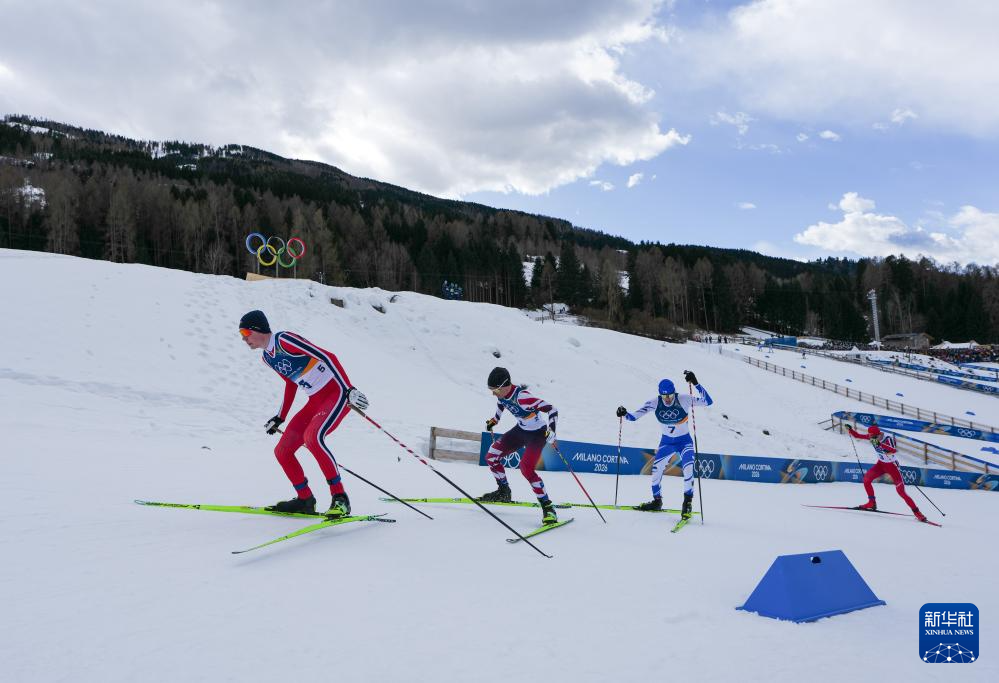 2月17日,挪威选手奥夫特布罗(左一)、奥地利选手兰帕特尔(左二)和芬兰选手海罗拉(右二)在10公里越野滑雪比赛中。