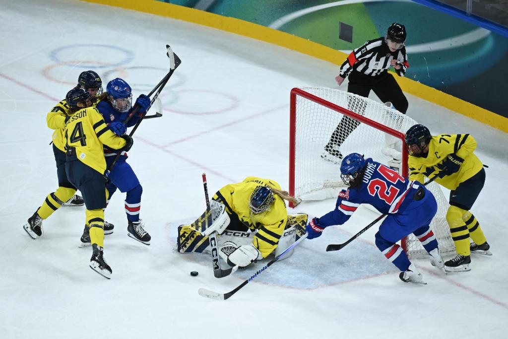 2月16日,美国队和瑞典队球员在比赛中拼抢。新华社记者 张豪夫 摄