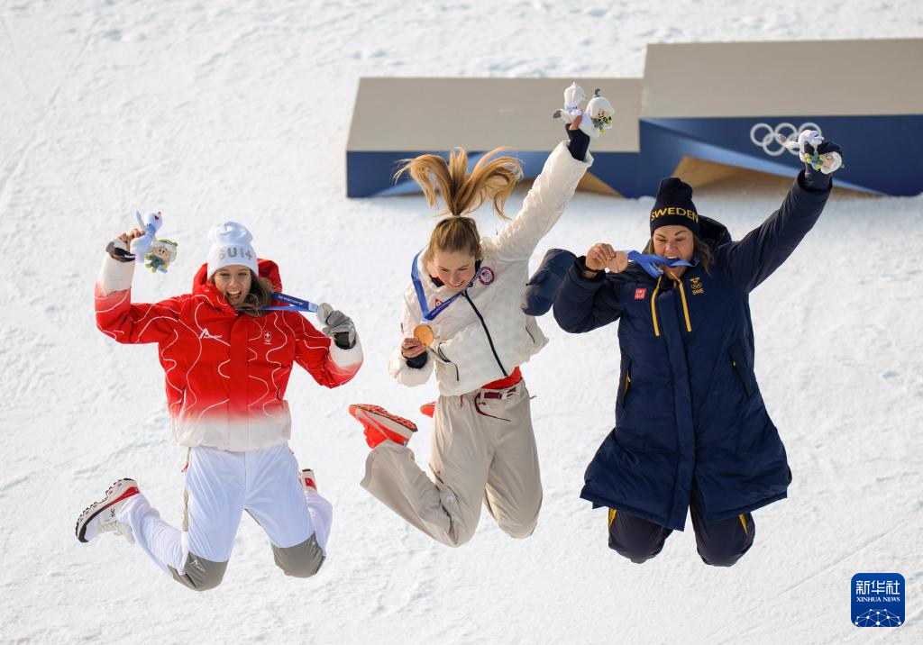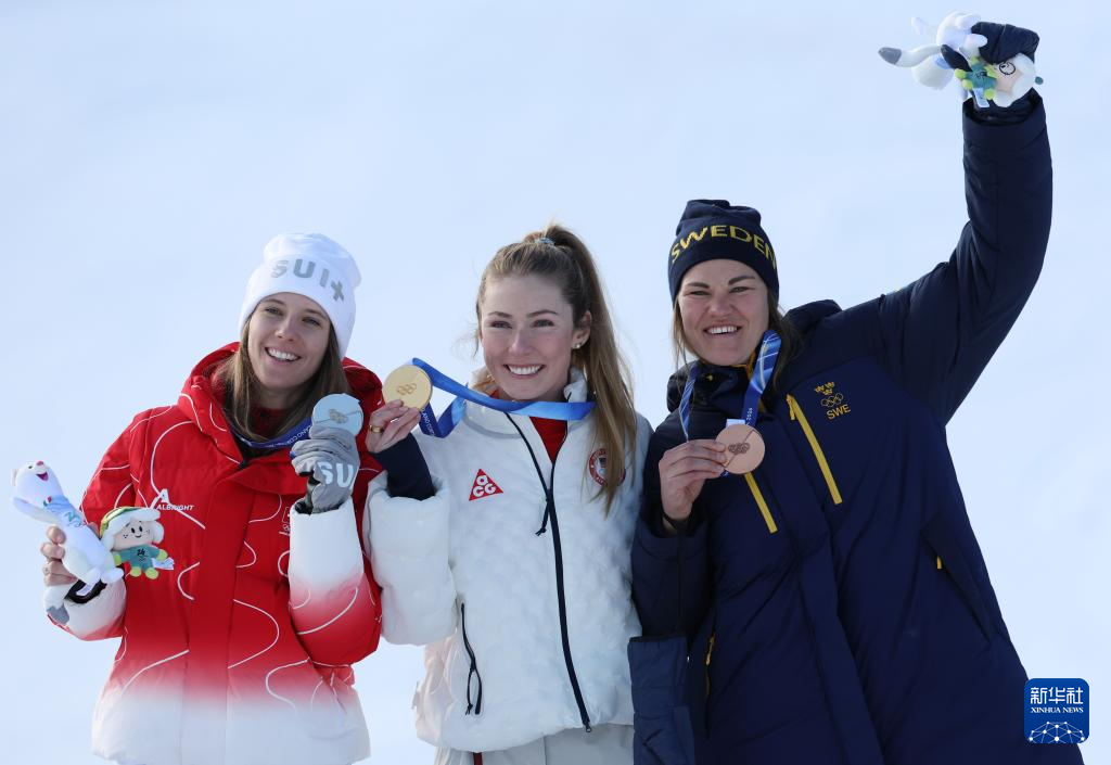 2月18日,冠军美国选手希夫林(中)、亚军瑞士选手拉斯特(左)和季军瑞典选手斯文·拉尔松在颁奖仪式上合影。