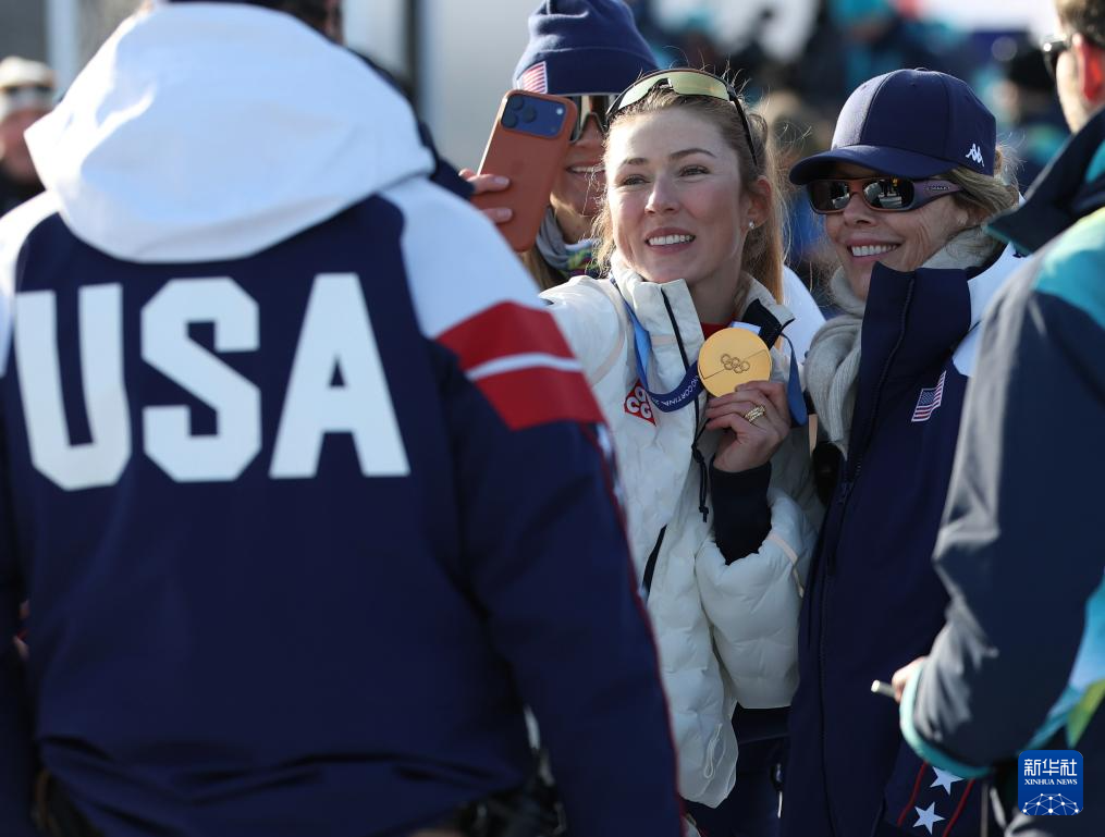 2月18日,冠军美国选手希夫林(上)在颁奖仪式后与队友庆祝。