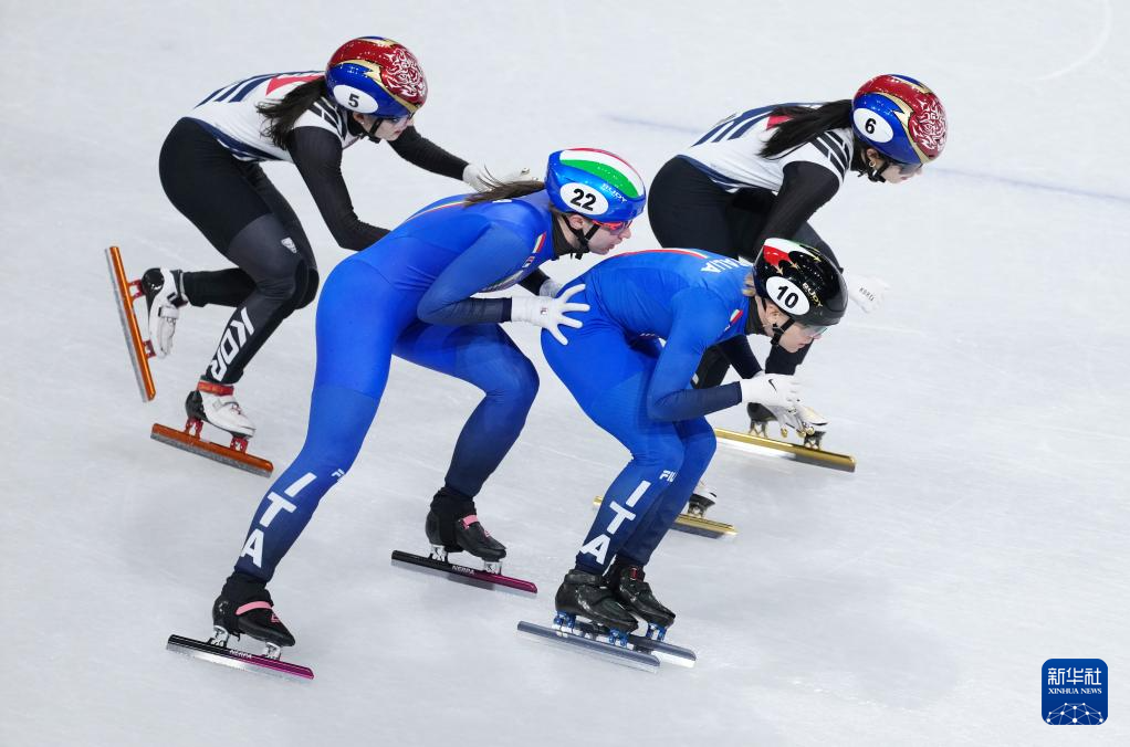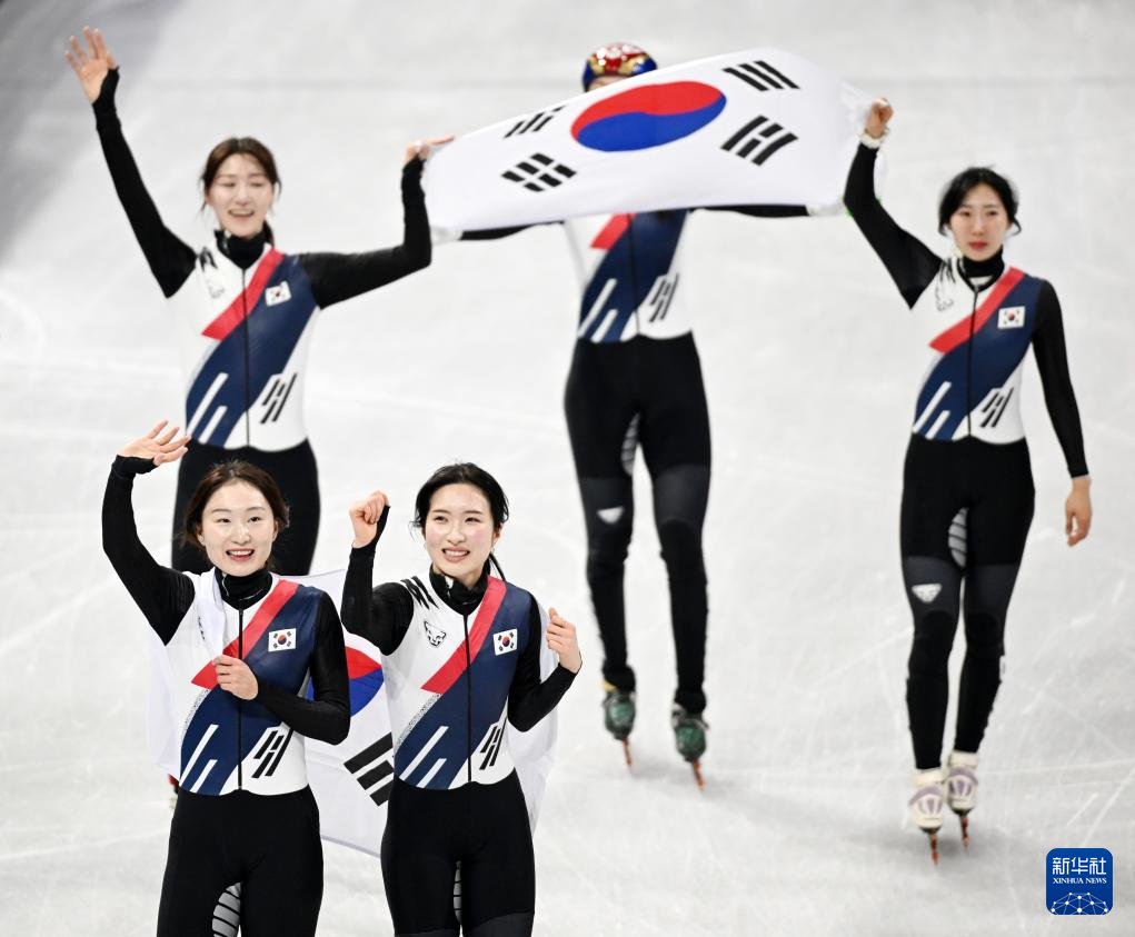 2月18日,韩国队选手金吉莉(右一)和崔敏静(左一)在比赛中接力。