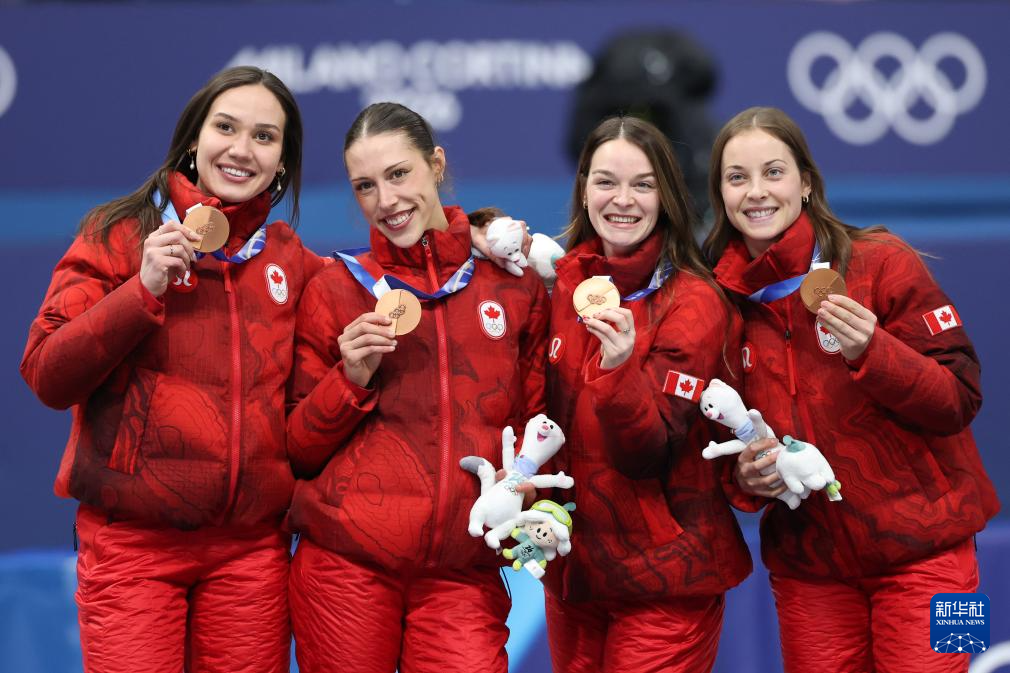 2月18日,季军加拿大队选手在颁奖仪式上。
