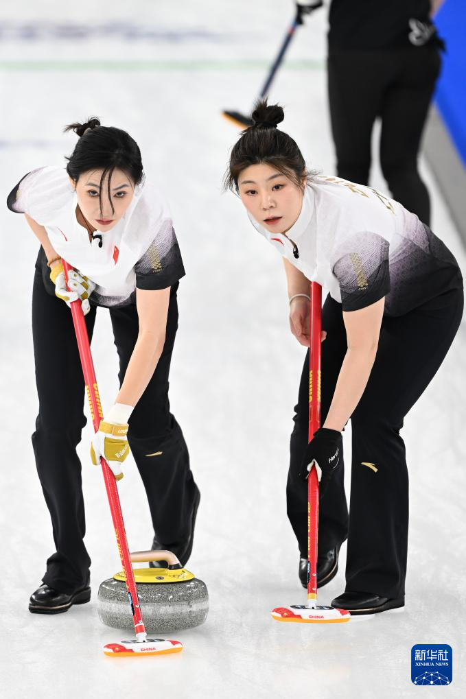 2月19日,中国队选手王芮(下)在比赛中掷壶。