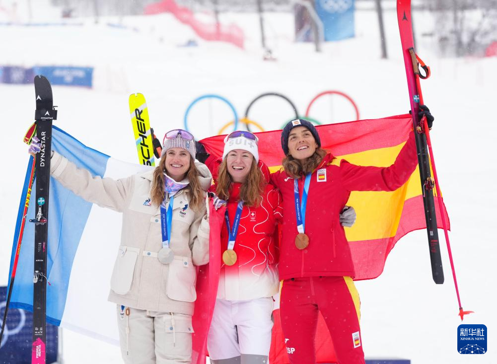 2月19日,冠军瑞士选手法东(中)、亚军法国选手哈罗普(左)和季军西班牙选手阿隆索·罗德里格斯在比赛后庆祝。