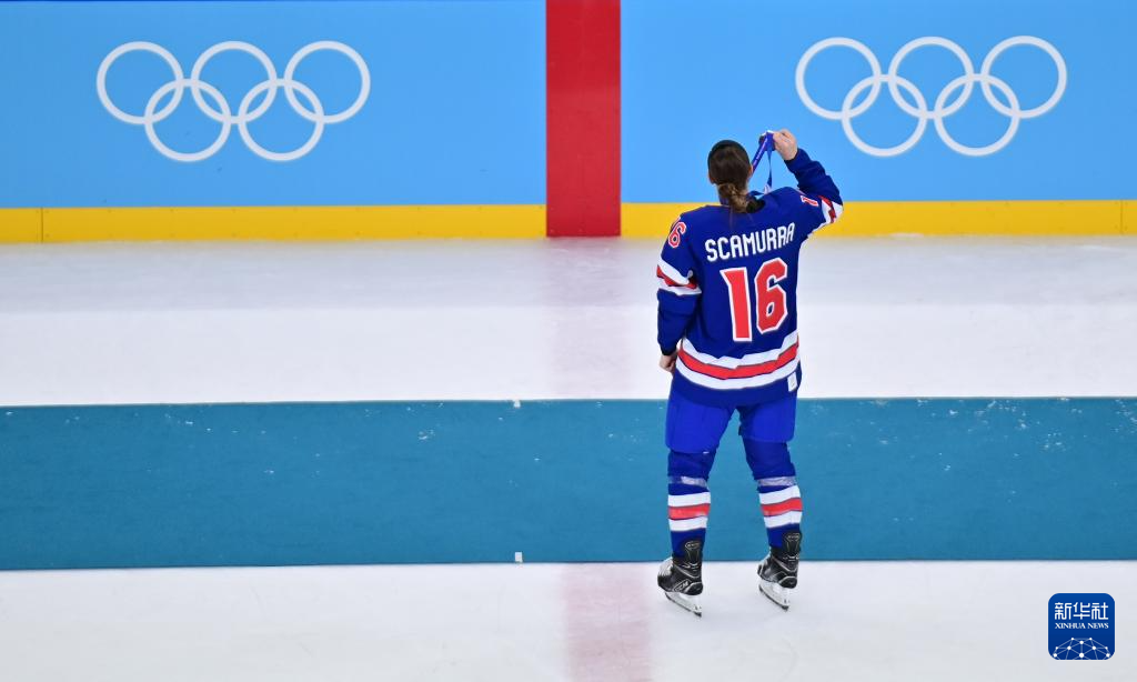 2月19日,美国队球员斯卡默拉在颁奖仪式后展示奖牌。