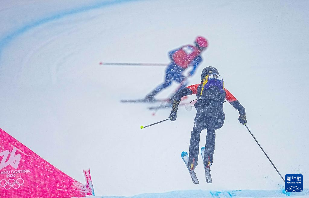 2月19日,法国选手安塞尔梅(右)和中国选手布鲁尔在比赛中。他们分别获得第三名和第八名。