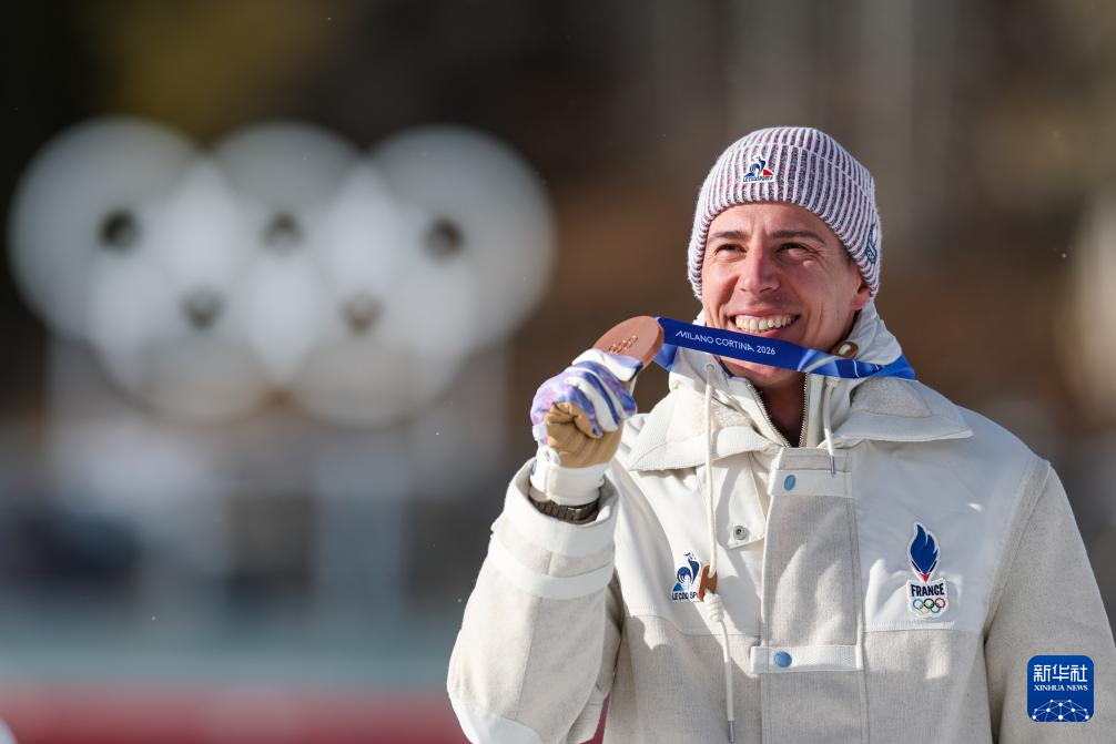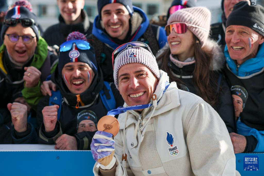 2月20日,季军法国选手康坦·菲永·马耶在颁奖仪式上庆祝。