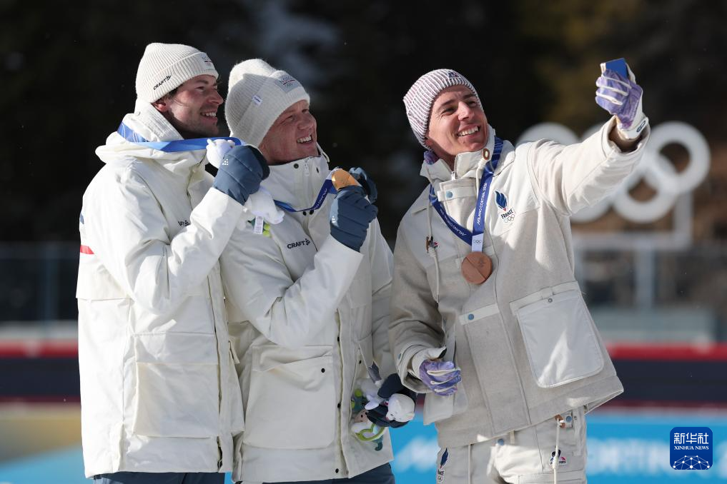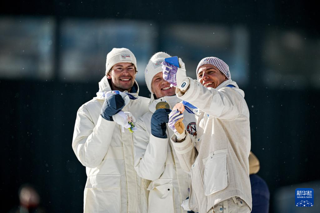 2月20日,亚军挪威选手斯图拉·霍尔姆·莱格雷德、冠军挪威选手约翰内斯·戴尔、季军法国选手康坦·菲永·马耶(从左至右)在颁奖仪式上自拍合影。