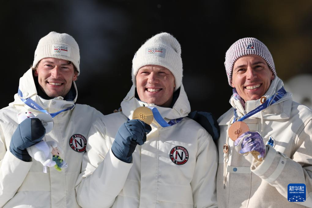 2月20日,亚军挪威选手斯图拉·霍尔姆·莱格雷德、冠军挪威选手约翰内斯·戴尔、季军法国选手康坦·菲永·马耶(从左至右)在颁奖仪式上合影。