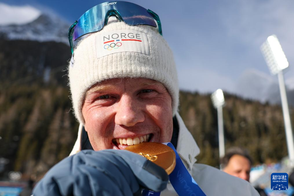 2月20日,冠军挪威选手约翰内斯·戴尔在颁奖仪式上庆祝。