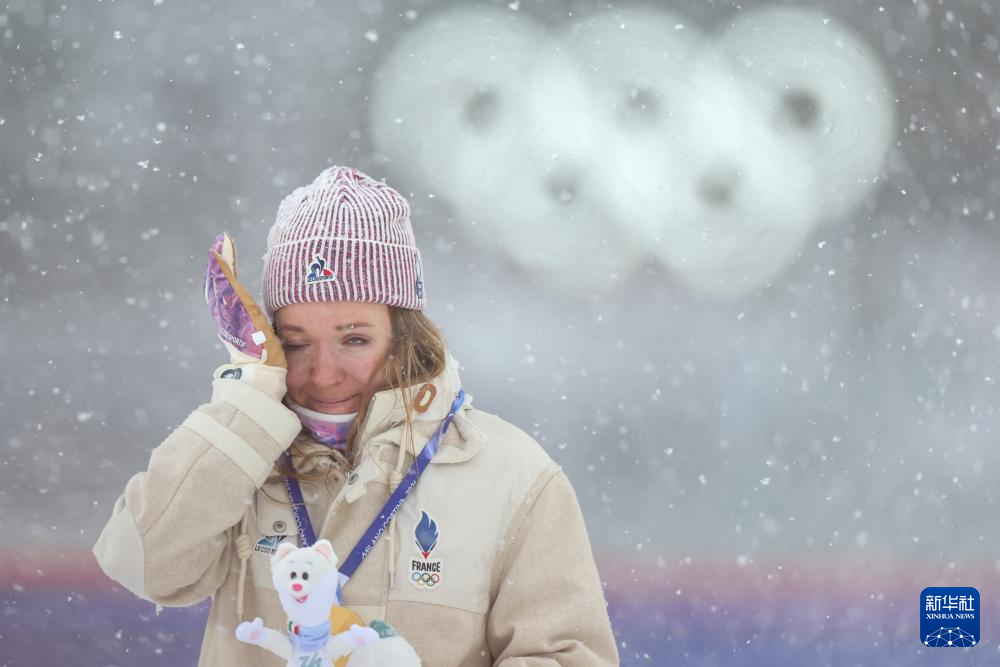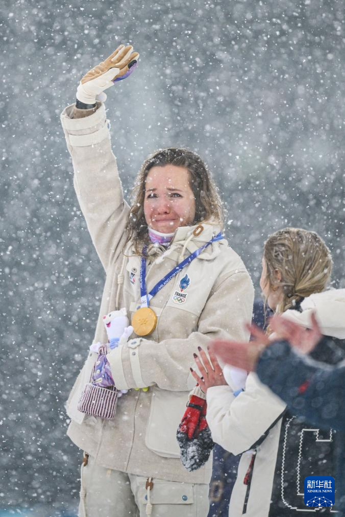 2月21日,冠军法国选手米舍隆在颁奖仪式上落泪。