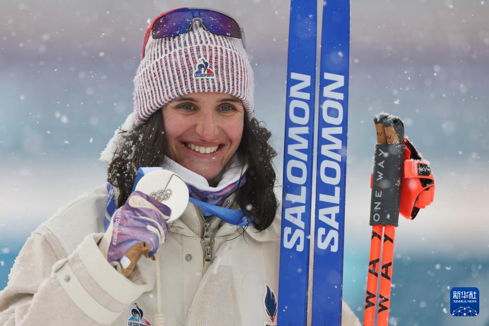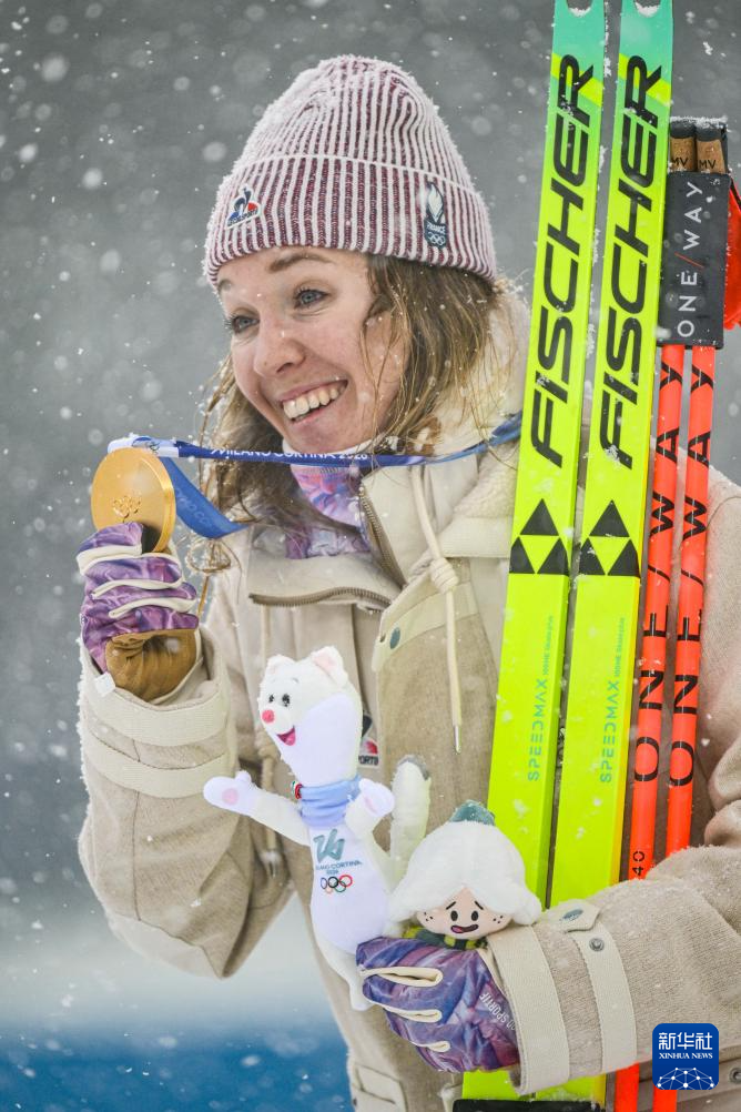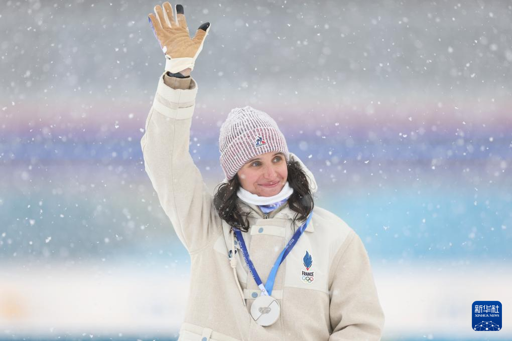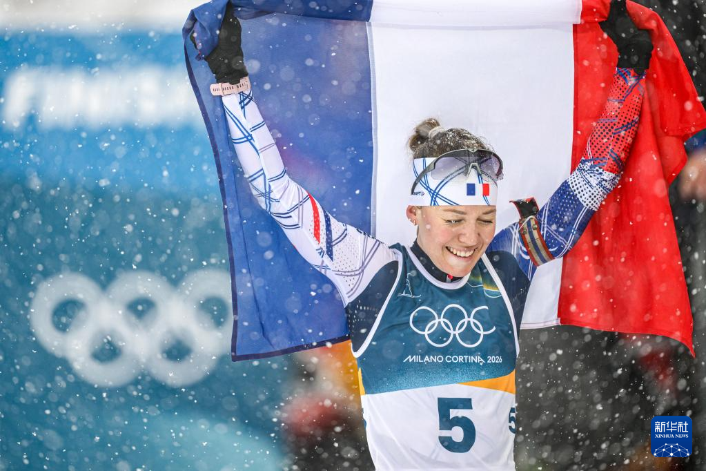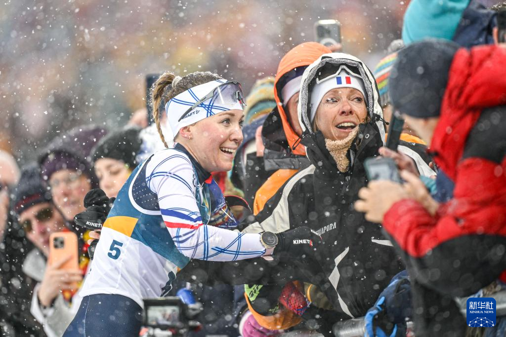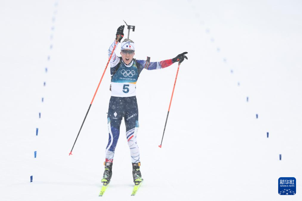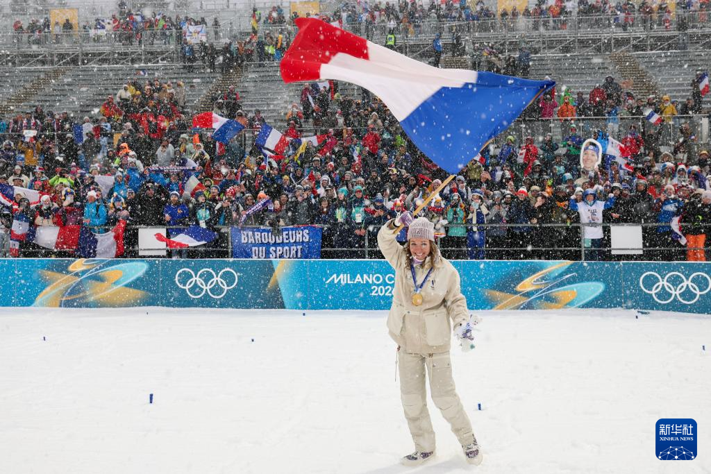2月21日,法国选手米舍隆在终点处庆祝。她获得冠军。